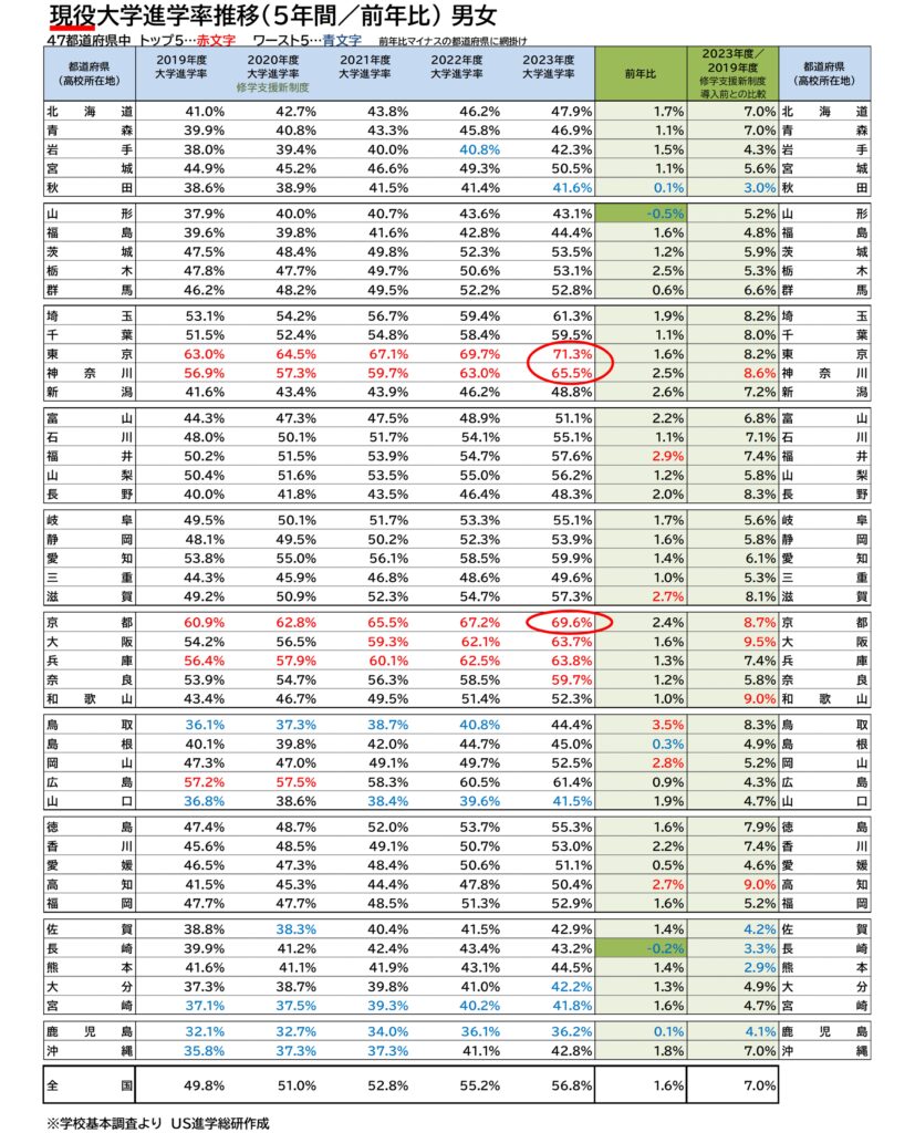 進学先に短大と通信制大学等を含む現役大学等進学率で集計すると、京都府が全国1位となる。東京都は全日制や定時制高校を卒業後に短大などに進学する生徒が少ないため、このような逆転が起こっています。